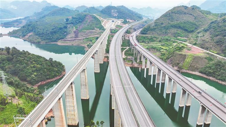 盘兴高铁纳怀河特大桥(左)、水兴高速纳怀河大桥(中)和兴清快速通道(右)并驾齐驱。贵州日报天眼新闻记者 刘朝富 摄 贵州日报天眼新... [详细]