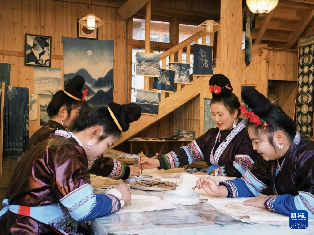 1月15日,陆勇妹(右二)正在和绣娘们一同画蜡。新华社记者 周宣妮 摄