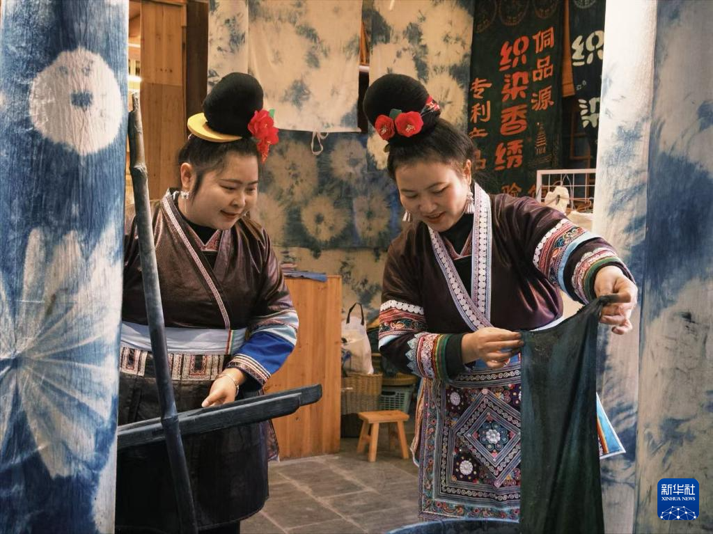 新华社贵阳1月17日电(记者周宣妮)走进贵州省黎平县肇兴侗寨,流水蜿蜒、青山绿水环抱着千年鼓楼,张灯结彩的街道,让这座古朴侗寨的年味越来越浓。侗寨一隅,侗族蓝靛靛染工艺省级非遗代表性传承人陆勇妹,正耐心细致地向游客讲解扎染的具体步骤。白色衣裙布料浸满蓝色,一抹蓝白,诉说着古老技艺的创新传承。