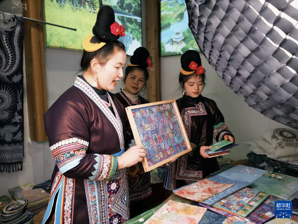 合作社内的非遗工坊,不同深浅的蓝色布料设置成的人工造景,成了侗寨游览的著名打卡点。不少外国游客前来观赏非遗工艺,选购合作社制作的非遗文创产品。