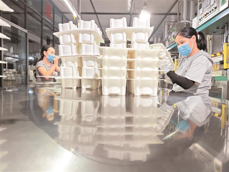 赤水“以竹代塑”企业生产的竹塑酒内托。 张浪 摄