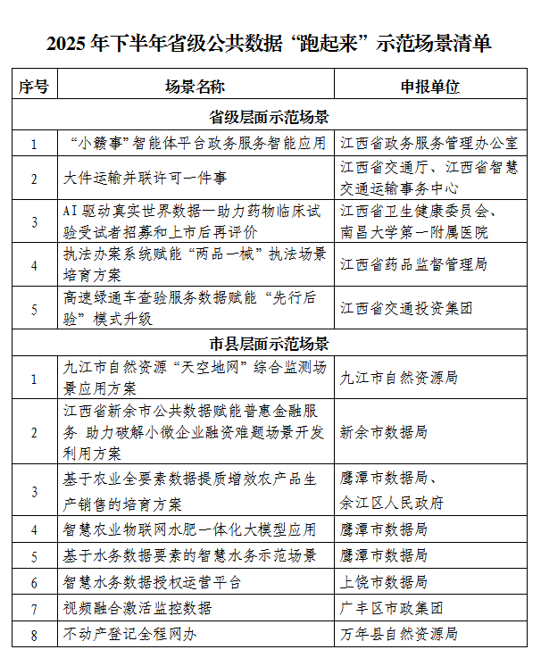 近日,江西省发展改革委(江西省数据局)正式公布首批13个省级公共数据“跑起来”示范场景清单,标志着江西省在推动公共数据资源开发利用、赋能经济社会高质量发展方面迈出关键一步。