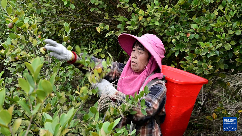 2025年10月30日,在贵州省铜仁市玉屏侗族自治县,工人在油茶种植基地采摘油茶果。新华社发(张金芳 摄)