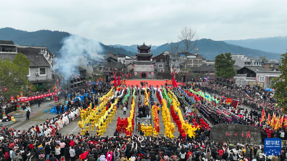 在贵州省锦屏县隆里古城拍摄的“村晚遇元宵·来隆里玩花脸龙”活动现场(2025年2月11日摄,无人机照片)。新华社记者 杨文斌 摄
