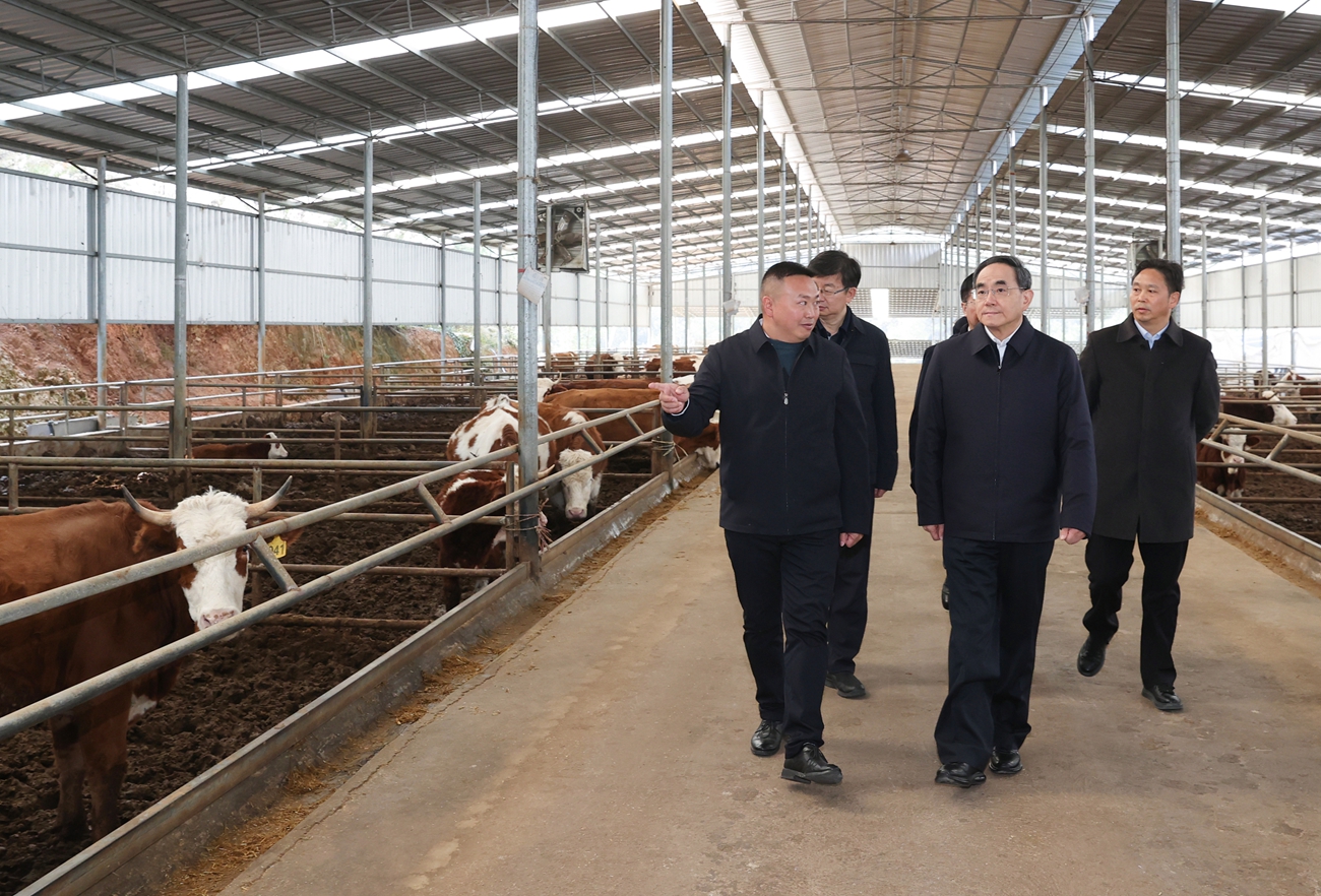 图为徐麟在岑巩县大有镇塔山村集体养殖场考察,了解产业发展带动群众增收等情况。