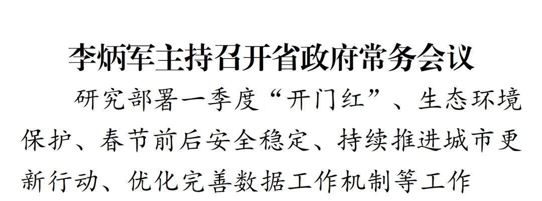 2月11日,省委副书记、省长李炳军主持召开省政府常务会议,研究部署一季度“开门红”、生态环境保护、春节前后安全稳定、持续推进城市更新行动、优化完善数据工作机制等工作。